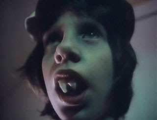 "Hey!" thought I, "That's pretty creepy! Maybe I'm in for some Brood-style nastiness." Sadly, the kids pull off their masks to reveal some truly awful candy-corn-esque teeth, which we can assume they use to bite the teacher to death. Yes, I said "assume", because the scene cuts back to the funeral home.